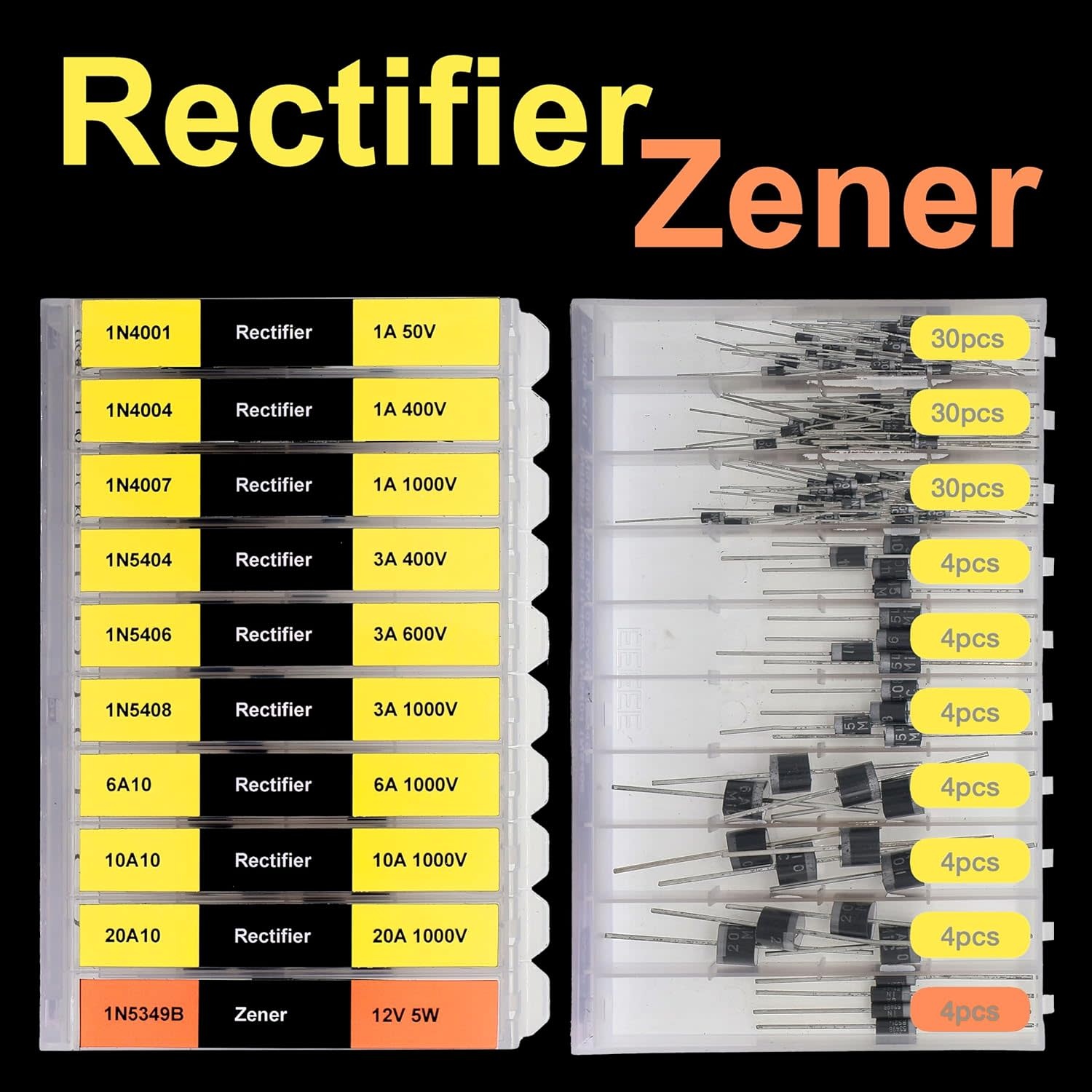EEEEE 118 Pack Rectifier/Zener Diode Assortment Kit, Rectifier 1N4001 (1A 50V), 1N4004 (1A 400V), 1N4007 (1A 1000V), 1N5404 (3A 400V), 1N5406 (3A 600V), 1N5408 (3A 1000V), 6A10 (6A 1000V), 10A10 (10A 1000V), 20A10 (20A 1000V) Zener 1N5349B (12V 5W) - RadioShack of Bozeman