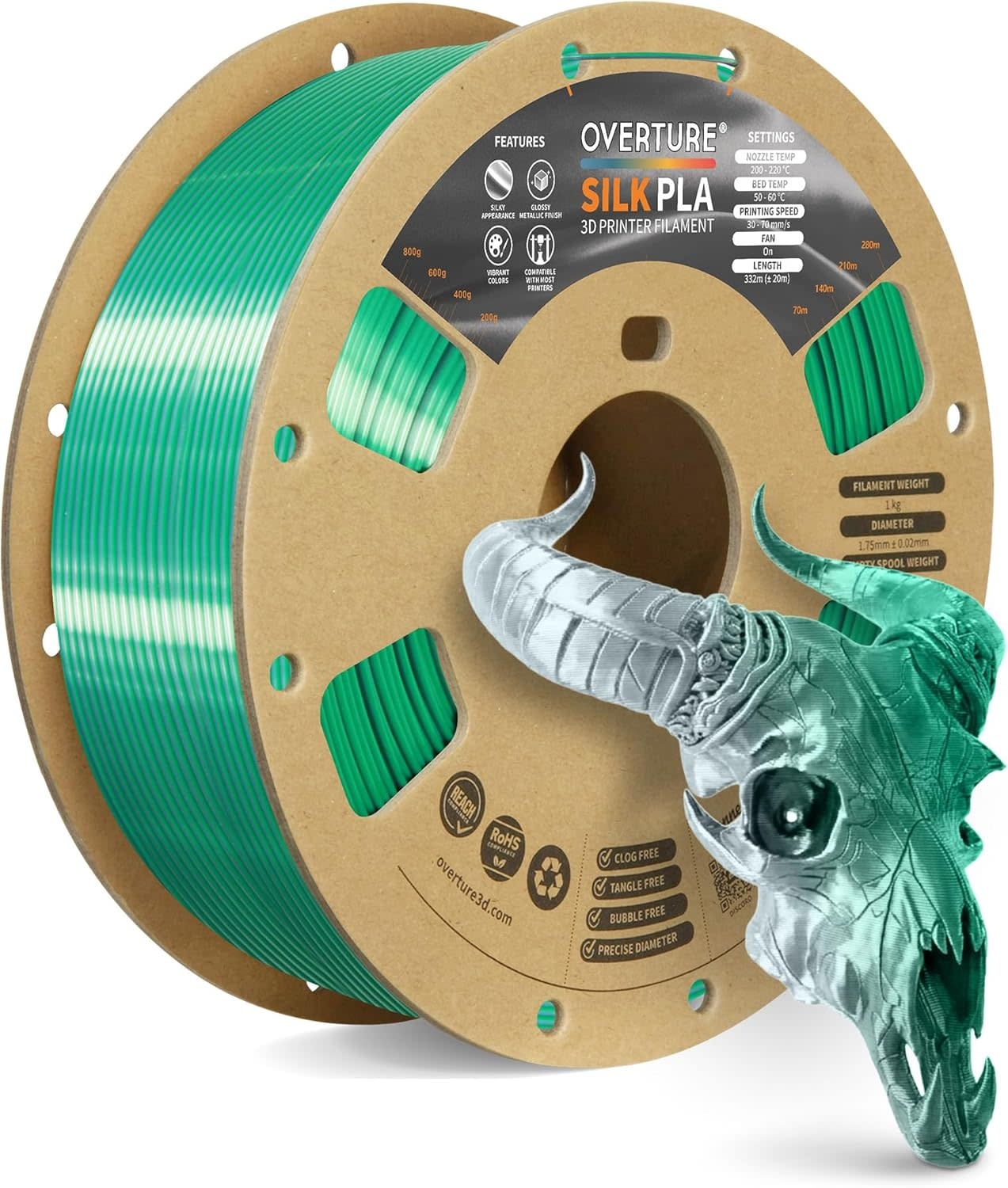 OVPLA-SILK-GREEN-SILVER- OVERTURE Silk Green Silver PLA Dual Color Filament 1.75mm, Bi-Color Shiny PLA Finish, Smooth & Glossy, 1kg Spool (2.2lbs), Ideal for Cosplay Jewelry & Home Decor (Silk Green-Silver) - RadioShack of Bozeman
