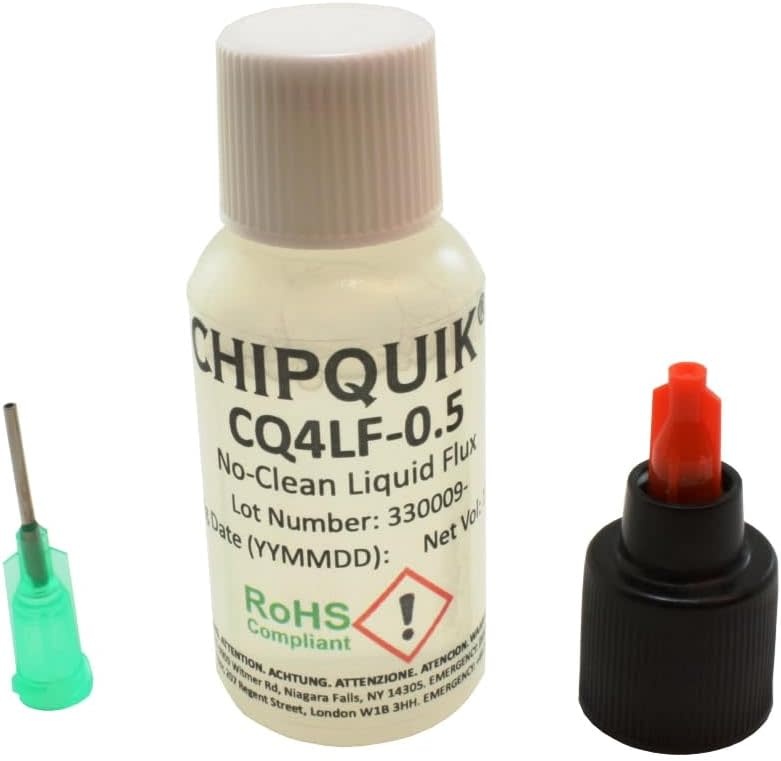 The Chip Quik CQ4LF-0.5 Liquid Flux No-Clean in a 15ml (0.5oz) squeeze bottle with a tip is designed for precise application in soldering and rework processes. This no-clean liquid flux is suitable for both leaded and lead-free applications. It is VOC-free, halide-free, and rosin-free, ensuring minimal residues and no need for post-solder cleaning. The flux has a specific gravity of 1.01 and an acid number of 38.0, classified under ORL0 flux type. The squeeze bottle packaging provides easy handling and accurate dispensing, making it ideal for delicate electronic work.