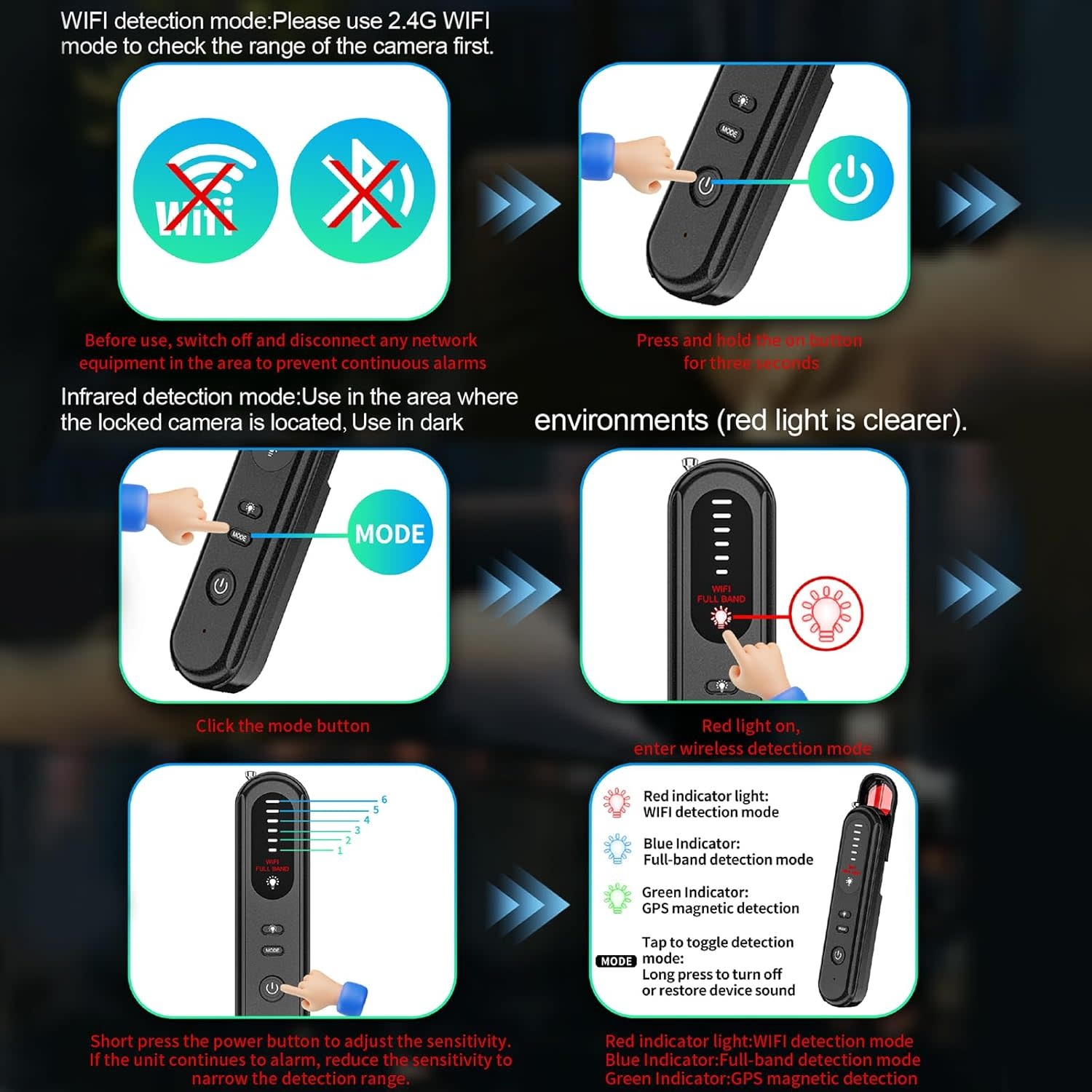 - Infrared Camera Detection: Uses infrared scanning to locate hidden cameras by reflecting their lens.