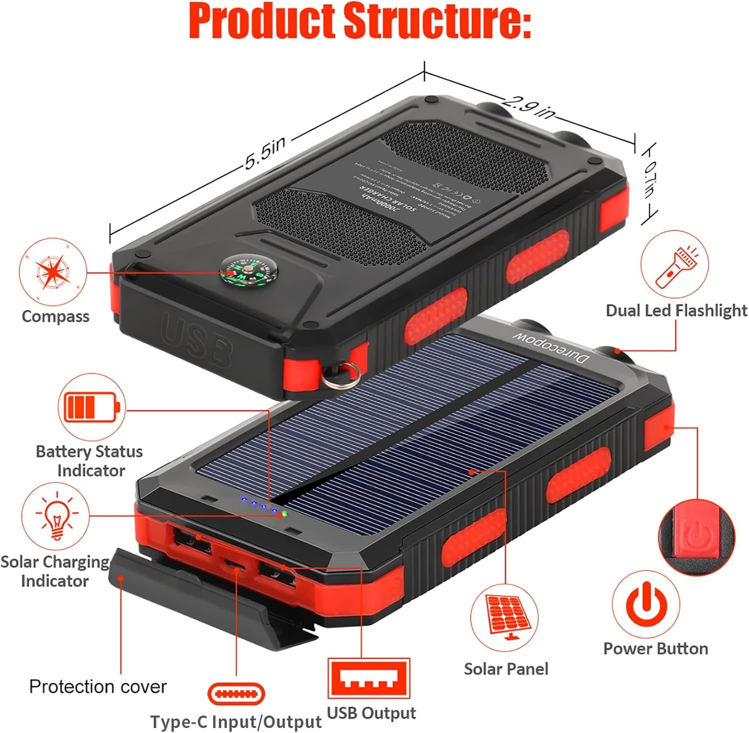 S1008D - Durecopow Solar Charger Power Bank, 20,000mAh Portable Outdoor Waterproof Solar Battery Charger, Camping External Backup Battery Pack USB C Ports Input/Output, 2 Led Light Flashlight with Compass (Red)