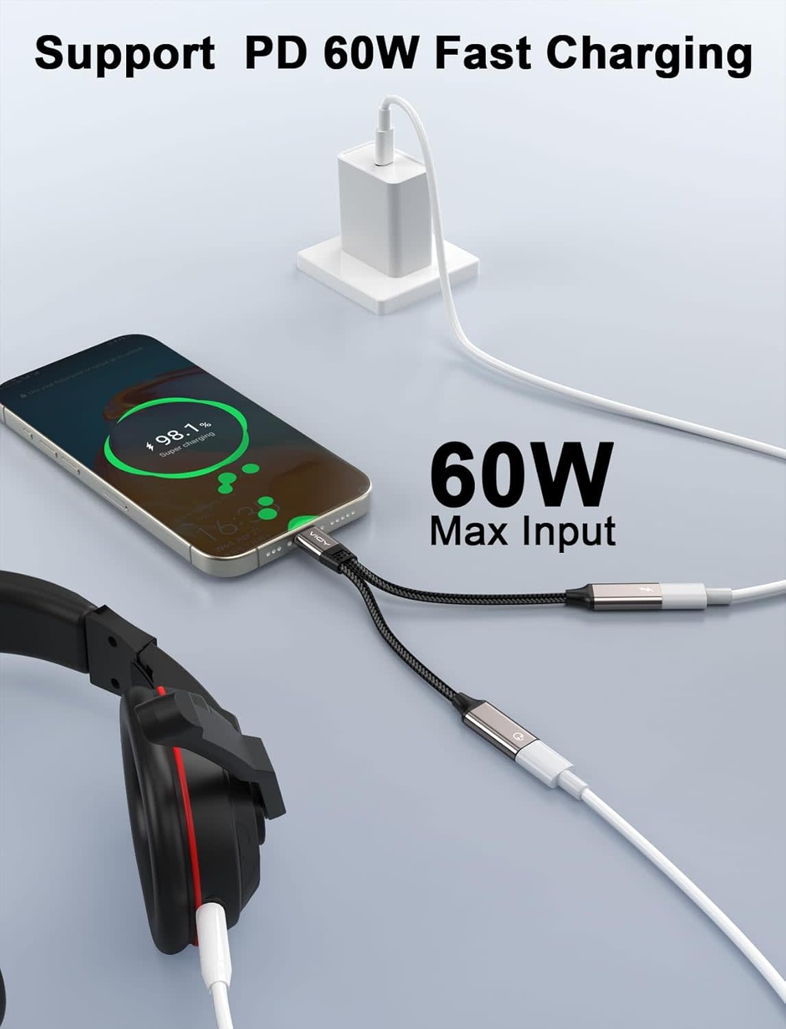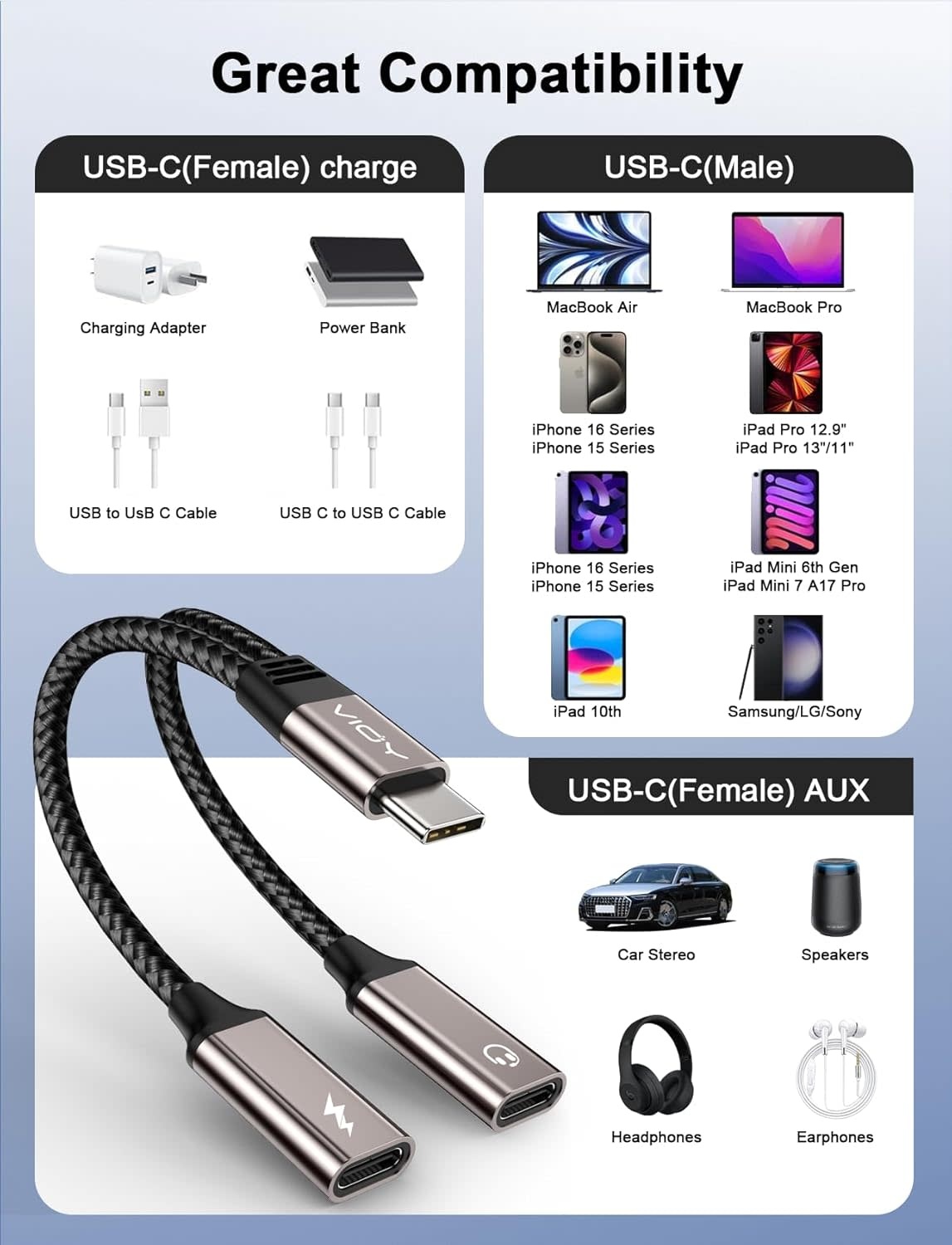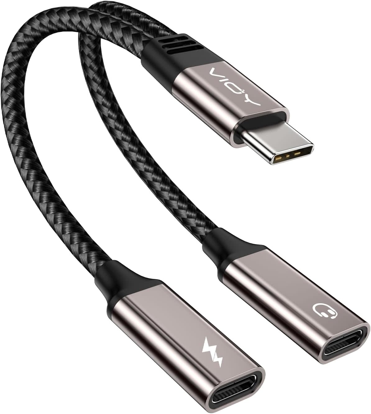 TC06 - VIOY USB-C Splitter 1 in 2 Out, Dual USB-C Headphone and Charger Adapter with PD 60W Fast Charging and Data Transfer for iPhone 16/15 Pro, iPad Pro, Samsung Galaxy S22 S21 S20, Pixel