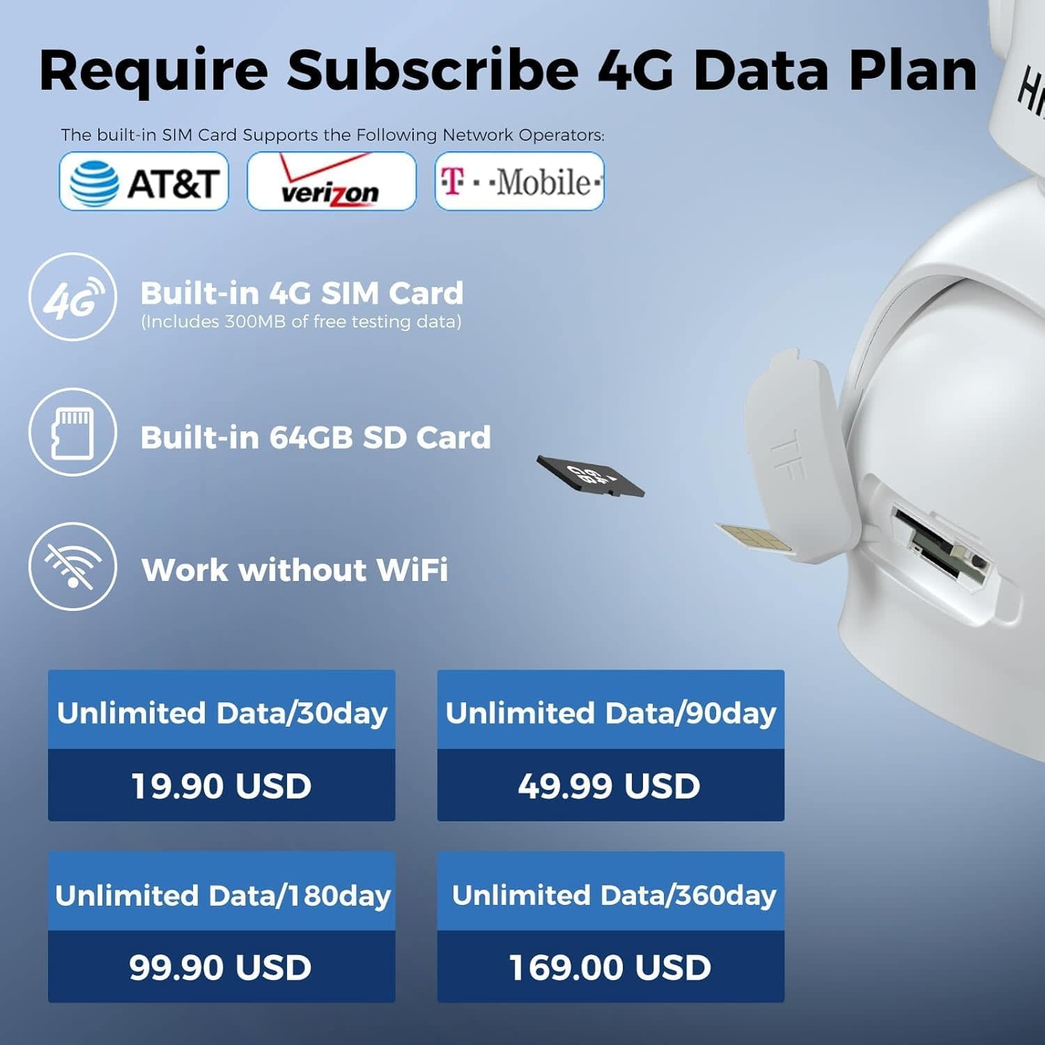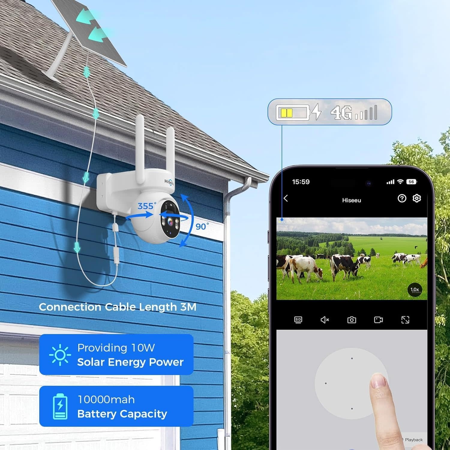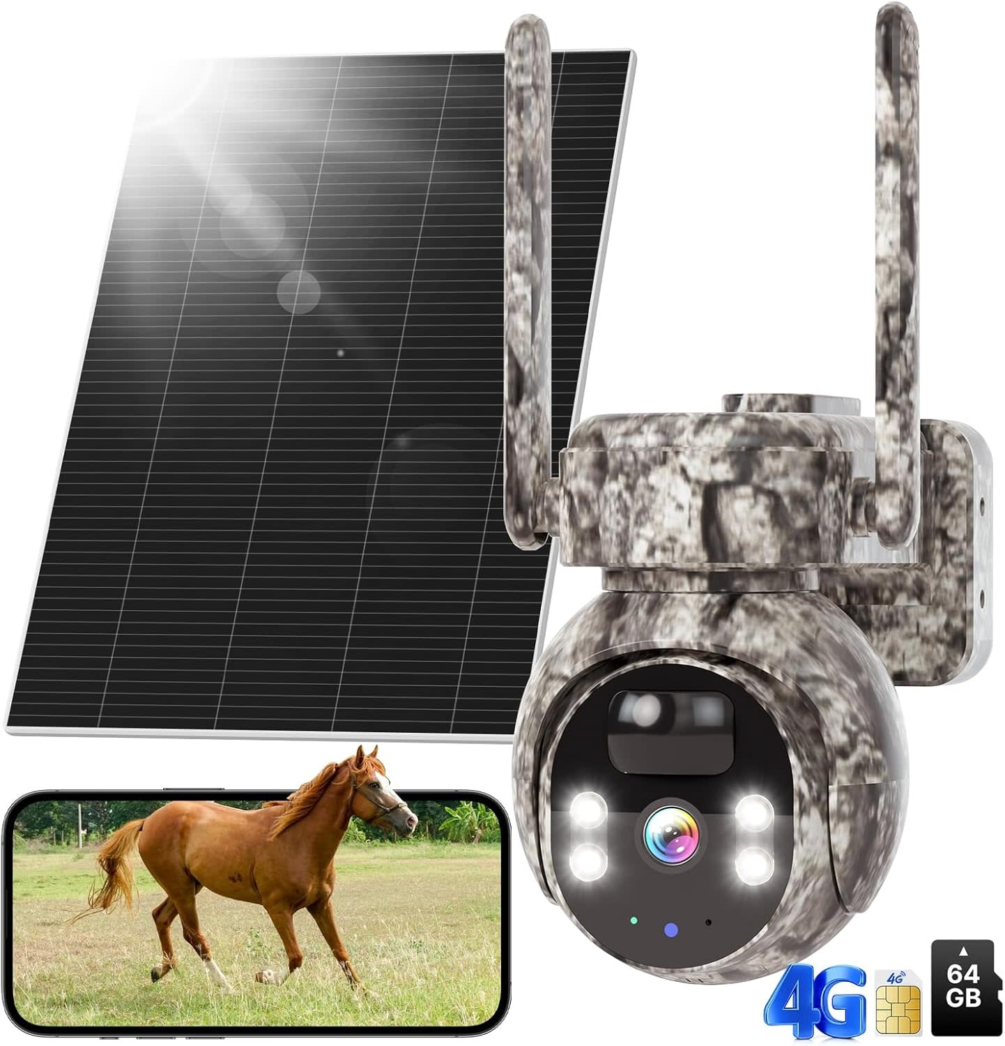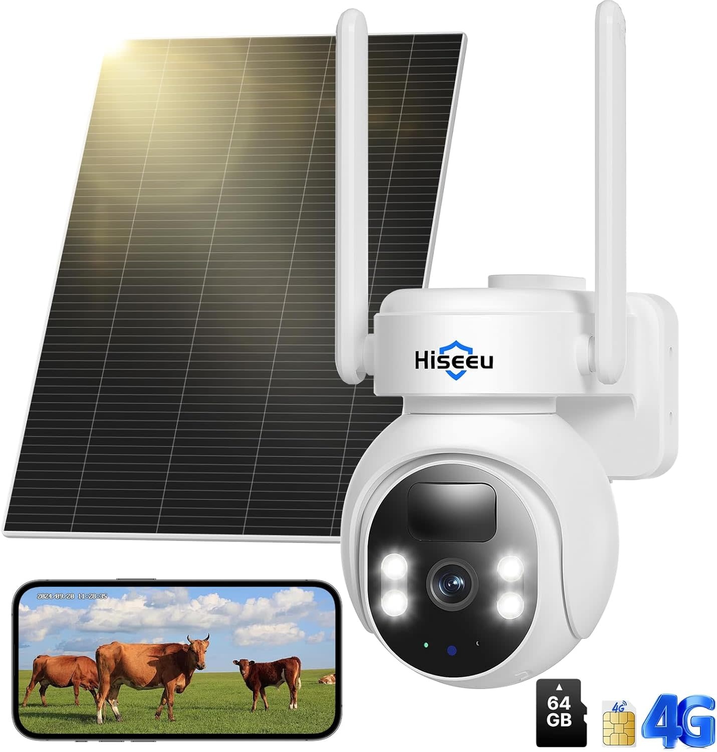 WK-3C70 - Hiseeu 4G LTE Cellular Security Camera Solar Powered, No WiFi Security Cameras Wireless Outdoor, PIR Motion, 2 Way Talk, 360° PTZ, 2K Color Night Vision, 64G SD & SIM Card Included
