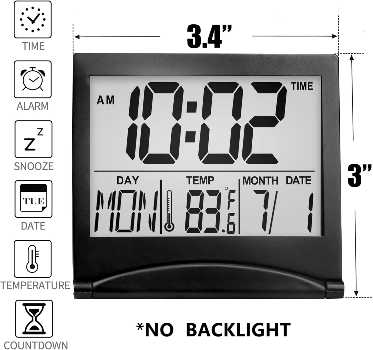 TRAVEL-CLOCK - Betus Digital Travel Alarm Clock – Foldable Calendar, Temperature & Timer with Snooze – Large Number Display, Battery Operated – Compact Desk Clock for Home & Office (Black)